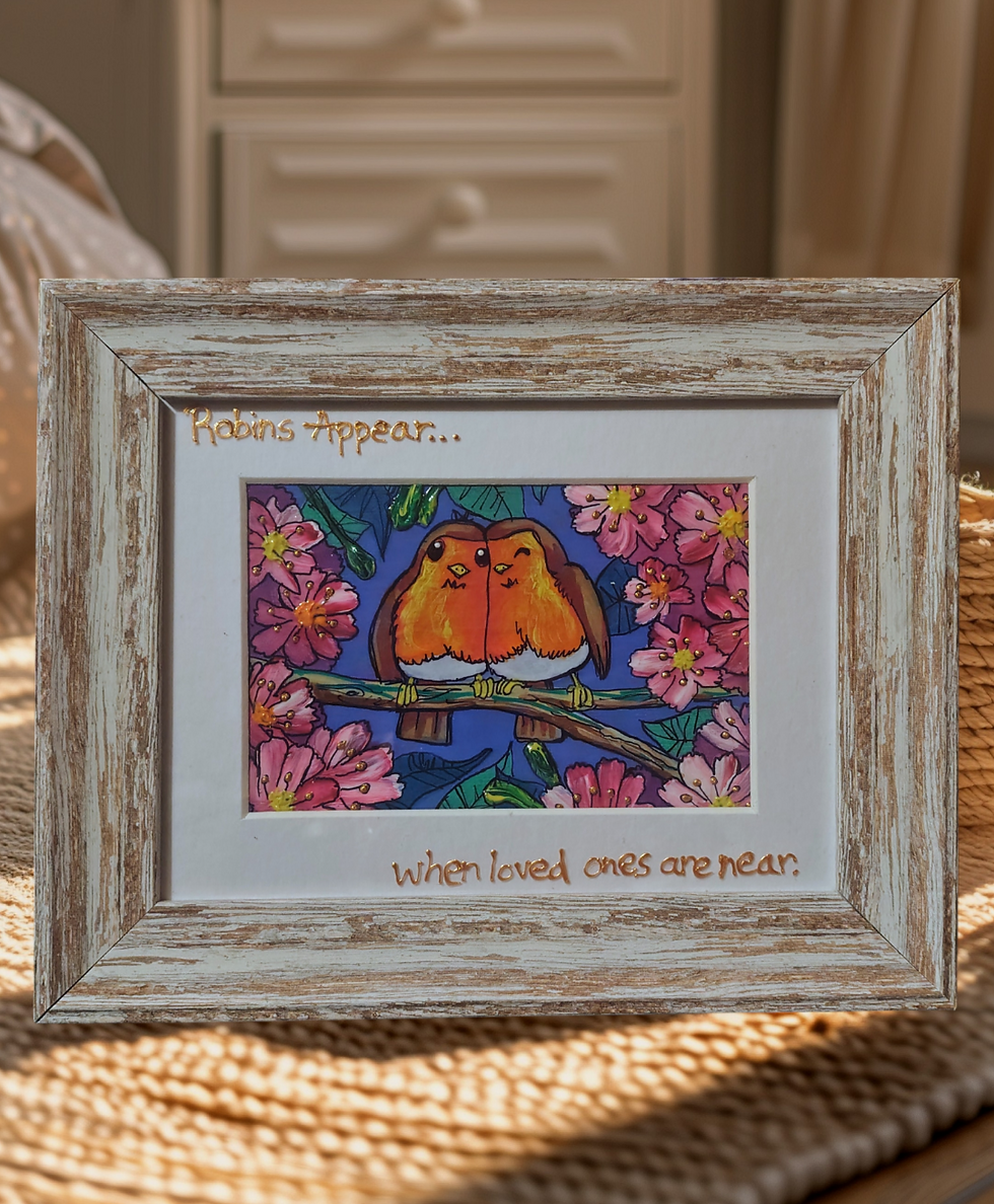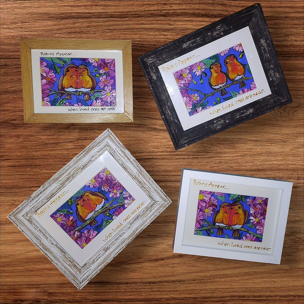 Framed in a wooden frame that is painted grey and white to really lift the colours and depth.